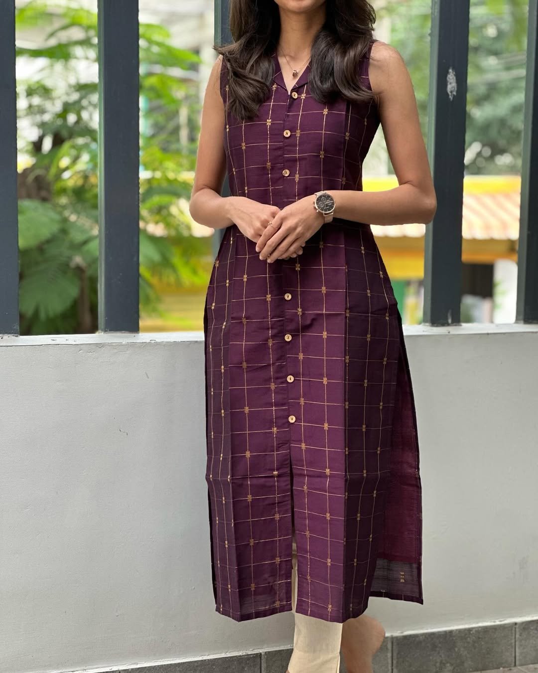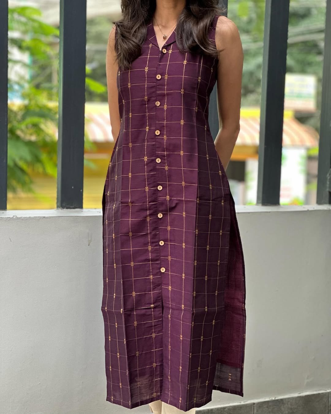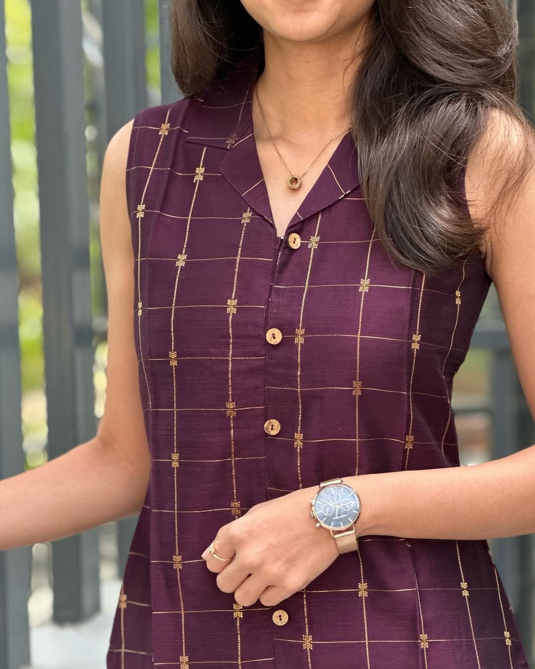 - Fabric & Design: Crafted from rich wine-colored raw silk with a subtle check pattern, adorned with delicate butterfly buttas.