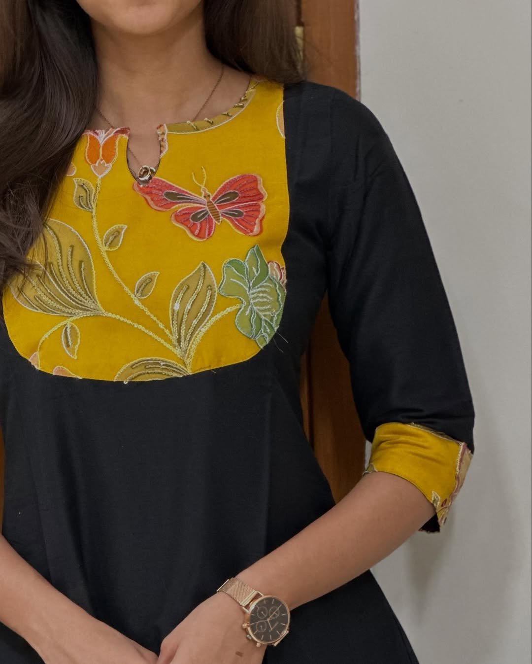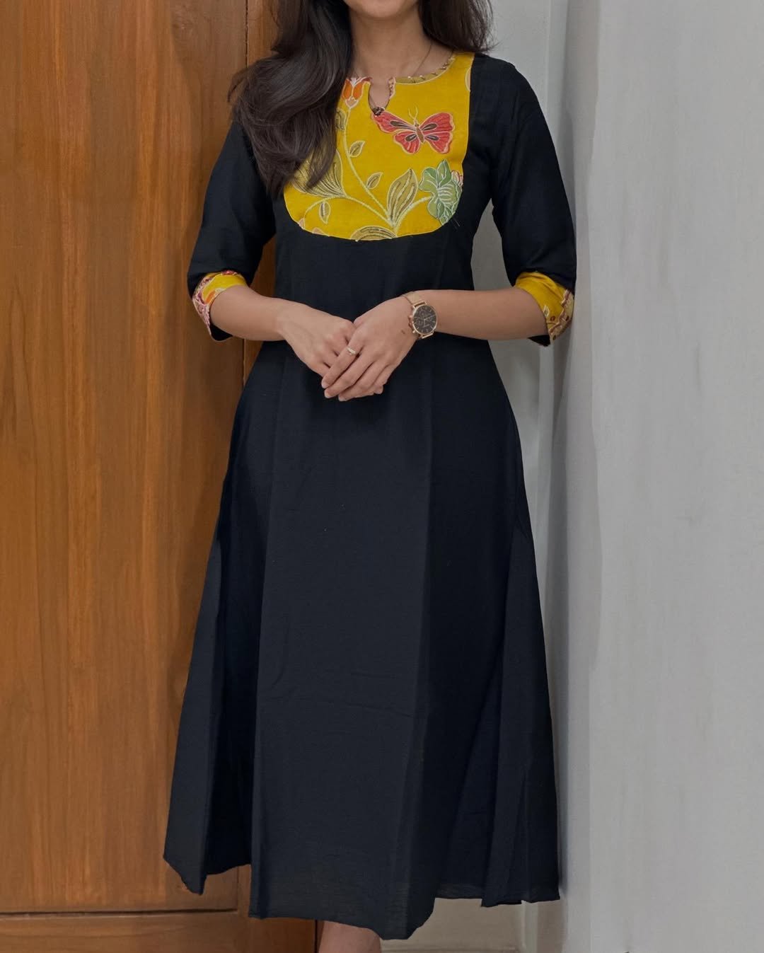 Elevate your elegance with the ES-390 Black Raw Silk A-Line Kurti/Maxi, featuring a heavy work organza sequins yoke patch and 3/4th sleeves with organza sequins patch ends. Cotton-lined for comfort, available in XXS to XXXL. Perfect for special occasions! DM to order now.