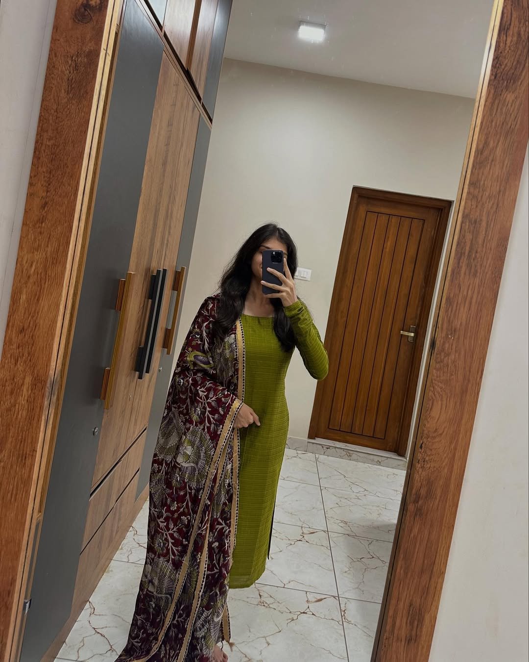 Infuse elegance into your everyday wear with the ES-458 cotton rib raw-silk kurta set. Highlighted with gold zari stripes and a unique pot neck design, this set is elevated with a hand-printed Kalamkari silk dupatta featuring traditional vegetable dye and bordered finish—perfect for classic yet contemporary wardrobes.